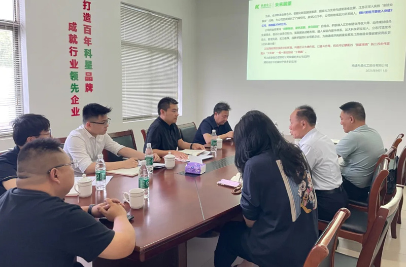 2025年9月11日下午,南通市發(fā)改委經(jīng)濟(jì)運(yùn)行調(diào)節(jié)處處長王帥軍,四級(jí)主任科員俞榮、姬一峰,海安市發(fā)改委黨組副書記、副主任楊成龍,白甸鎮(zhèn)副鎮(zhèn)長郭勇及經(jīng)發(fā)辦相關(guān)負(fù)責(zé)人蒞臨南通科星化工股份有限公司開展走訪調(diào)研工作。