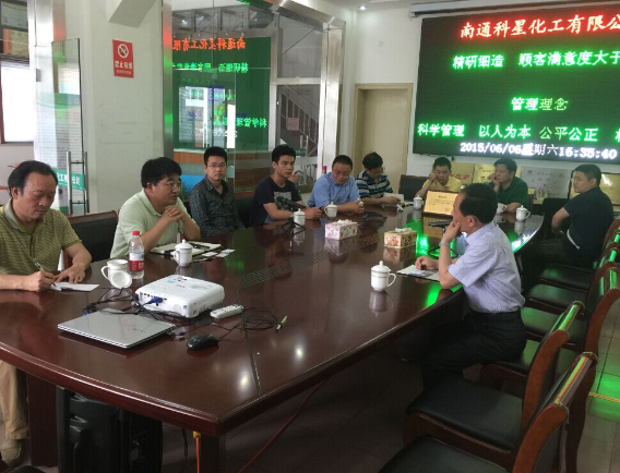 2015年6月6日,中國(guó)新型建材設(shè)計(jì)研究院黨委書(shū)記、副院長(zhǎng)施存有先生(左一)、美國(guó)Meecotech納米技術(shù)首席技術(shù)官許之詠博士(左二)、中央“千人計(jì)劃”專家、南通科星化工有限公司技術(shù)總監(jiān)姜興茂教授(左五)在科星公司會(huì)議室與董事長(zhǎng)吳龍鐵先生就納米新材料及其它技術(shù)進(jìn)行廣泛交流。
