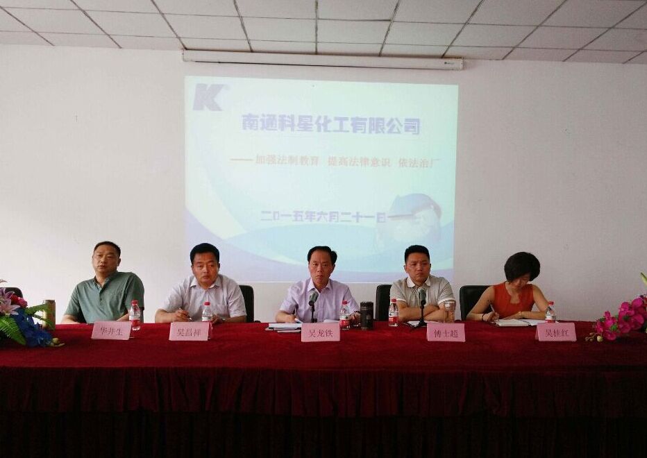 為了提高全體員工遵章守法的意識,依法治廠,南通科星化工有限公司于2015年6月21日上午在公司南廠區(qū)會議室對全體員工進行了“加強法制教育,提高法律意識,依法治廠”的教育主題活動。會上,董事長吳龍鐵在報告中指出:“黨的十八大四中全會習總書記提出依法治國的大政方針”,作為我們企業(yè),在進行管理中必須嚴格遵守國家法律法規(guī),每個員工都要嚴格執(zhí)行公司十六項規(guī)章制度和員工手冊,人人做安全生產、環(huán)境保護等各項法律法規(guī)的守護神。