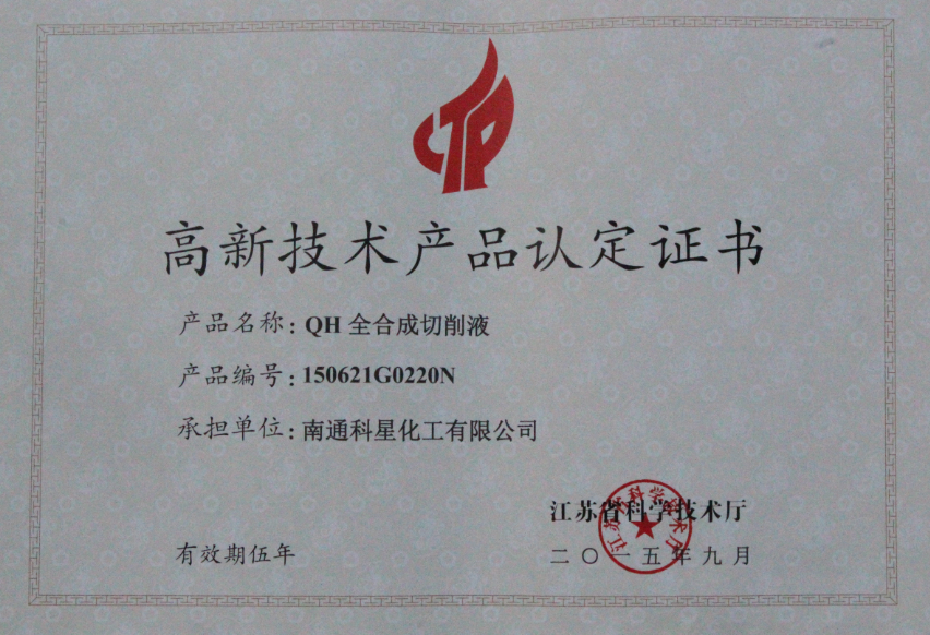 我公司QH全合成切削液榮獲省高新技術(shù)產(chǎn)品。該產(chǎn)品是一種新型環(huán)保高效切削液,與目前市場所用切削液產(chǎn)品相比較,具有更先進的技術(shù)水平,完全達到油性乳化液產(chǎn)品性能。使用周期長,管理得當(dāng),長期使用無需更換槽液。有著優(yōu)良的潤滑極壓性、冷卻性,防銹性、沉降性、油水分離性和清洗性等性能,工作液清澈透明,適用范圍廣,適合各種金屬材料的生產(chǎn)加工工藝。