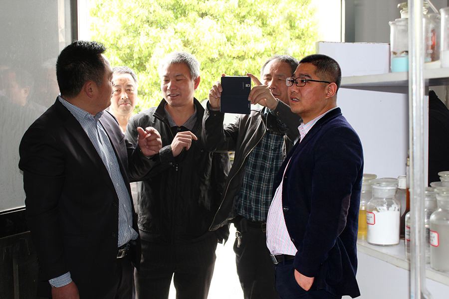 科星化工銷售總監(jiān)吳昌祥(左一) 在理化室,與五洲新春集團(tuán)領(lǐng)導(dǎo)著重介紹了在生產(chǎn)過程中如何對貨品取樣抽檢,以及對品質(zhì)全程把控的工序流程。富日泰俞總(右二)裘廠長(左二)森春有限公司陳總(右一)李總(右三)