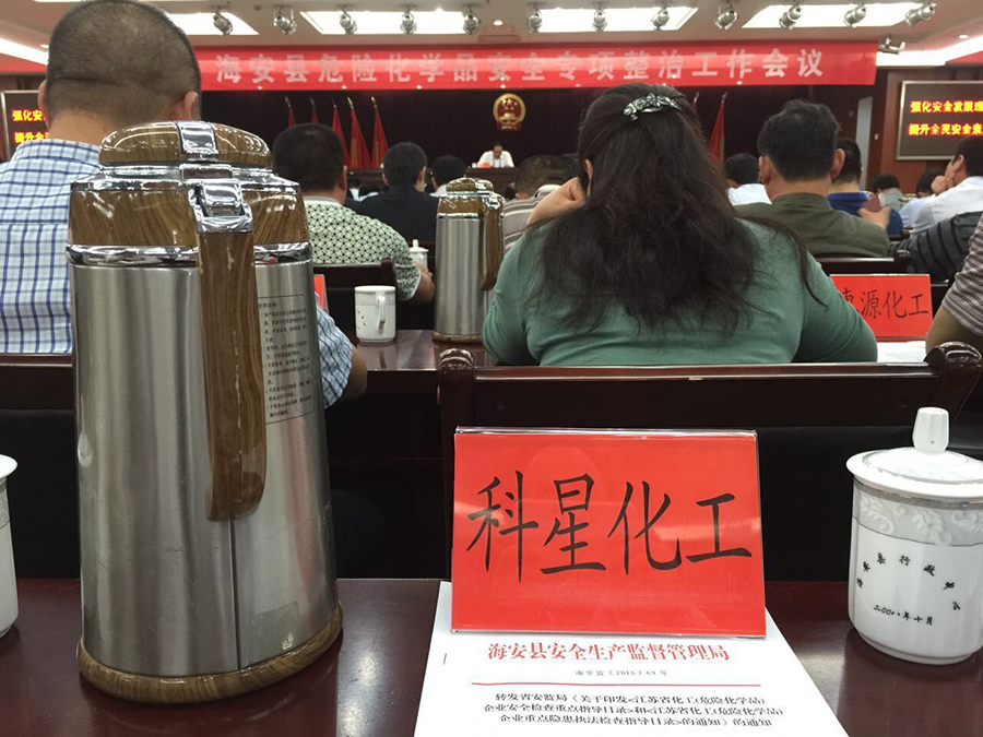 6月7日,海安縣危險(xiǎn)化學(xué)品安全專項(xiàng)工作會(huì)議在縣政府報(bào)告廳舉行。 南通科星化工有限公司董事長(zhǎng)吳龍鐵親自參加會(huì)議。