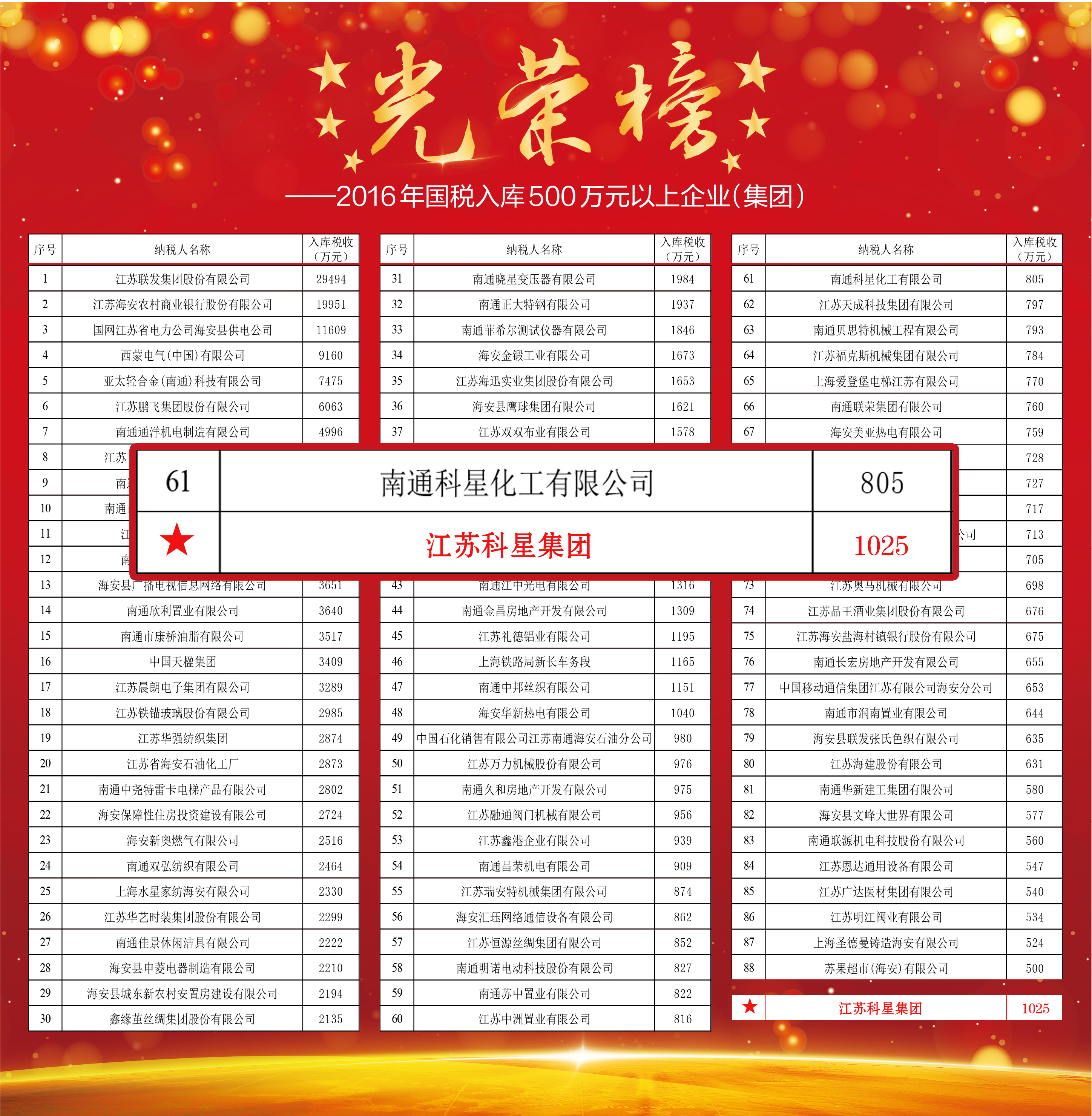 2016年,在縣委縣政府和南通市國稅局的正確領導下,江蘇科星集團暨南通科星化工有限公司實現(xiàn)集團公司稅收超千萬,堅持以環(huán)保、安全、消防、質量、節(jié)能、高效的經(jīng)營理念,取得了驕人業(yè)績。
