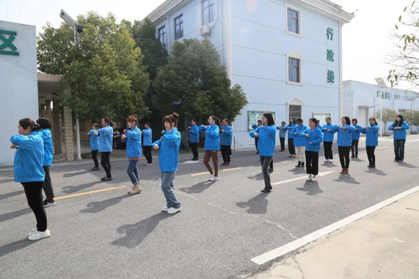 在生產(chǎn)基地的生活區(qū),全體女職工身著統(tǒng)一服裝,伴隨著激情昂揚(yáng)的旋律,以整齊的動(dòng)作、飄逸的舞步,淋漓盡致地展現(xiàn)了她們的活力和風(fēng)采。