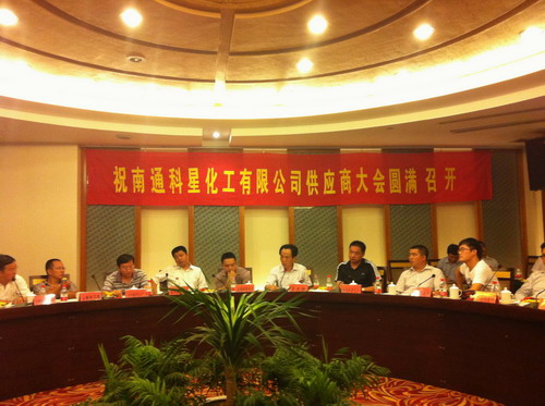首先請代表們到公司參觀生產(chǎn)、研發(fā)、倉儲、辦公現(xiàn)場,在公司多功能會議室,代表們觀看了公司產(chǎn)、供、銷和公司發(fā)展史影像片,然后到主會場——海安王府賓館四樓召開了全體供應(yīng)商會議,同時邀請了地方政府、金融系統(tǒng)領(lǐng)導(dǎo)一同參加。會上,吳總首先介紹了公司近年來發(fā)展情況,接著就原料的質(zhì)量等問題提出了我公司的要求。最后由上海甲基、南京古田化工、泰州東興物資、南通仁和化工供應(yīng)商代表發(fā)言講話。