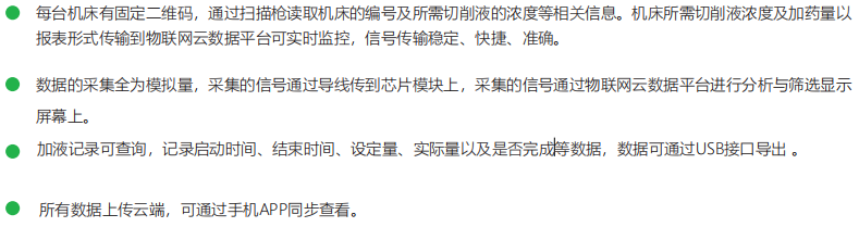 本系統(tǒng)通過掃碼槍讀取機床標號及所需要切削液數(shù)量等信息,系統(tǒng)定量給機床添加工作液并記錄時間,數(shù)量等數(shù)據(jù),同時保存數(shù)據(jù)并上傳,本系統(tǒng)可移動、性能可靠、顯示直觀、操作簡單。