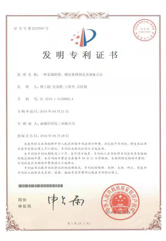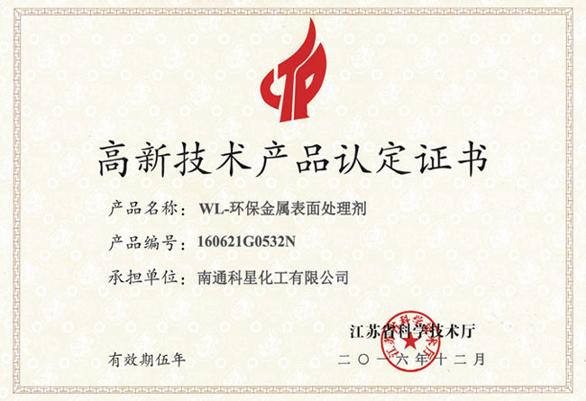高新技術產品認定證書-WL-環(huán)保金屬表面處理劑